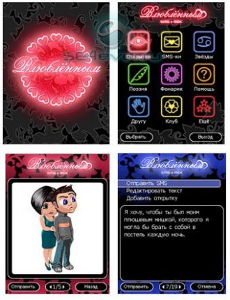 - удобная навигация меню - большая библиотека романтических открыток - коллекция "Зодиак" из для каждого из знаков зодиака - 200 уникальных сообщений - самые трогательные и романтические признания, комплименты и стихотворения - бонусы: «Фонарик» - возможность отправки сообщений и открыток по SMS, Bluetooth и MMS - простой и удобный выбор контактов из адресной книги телефона